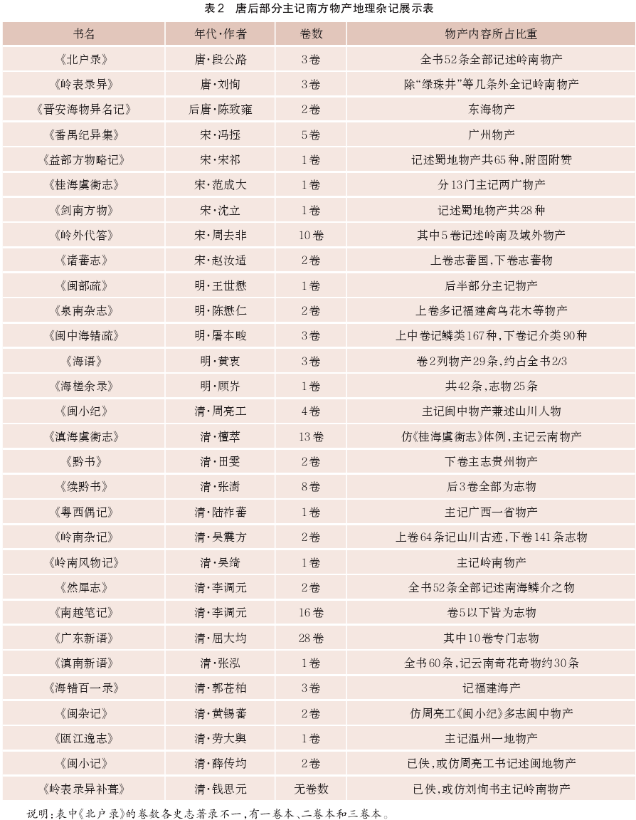 其次,通过表2中“物产内容所占比例”一栏可以清楚地看到,唐后这部分地理杂记与“异物志”一样,都以南方物产为写作对象,且志物比例相当高,多者如《北户录》《然犀志》等,全书全部记录物产;少者该比重也至少占据半数以上,内容相对单一,在地理杂记中较为特殊,可以视作另一种形式的物产专志。