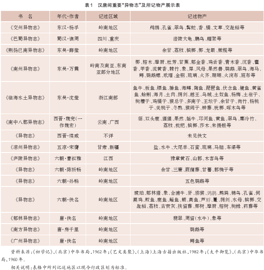第五,命名方式统一。中古时期也有以其他方式命名的物产专志,如徐衷《南方草物状》和束皙《发蒙记》,但都未如“异物志”般形成写作现象。从2世纪至9世纪,“异物志”的写作传统一直在延续,命名方式稳定且统一,大致以“地名”加之“异物志”,盖如王庸先生所言,是“当时述作之一种风尚”。