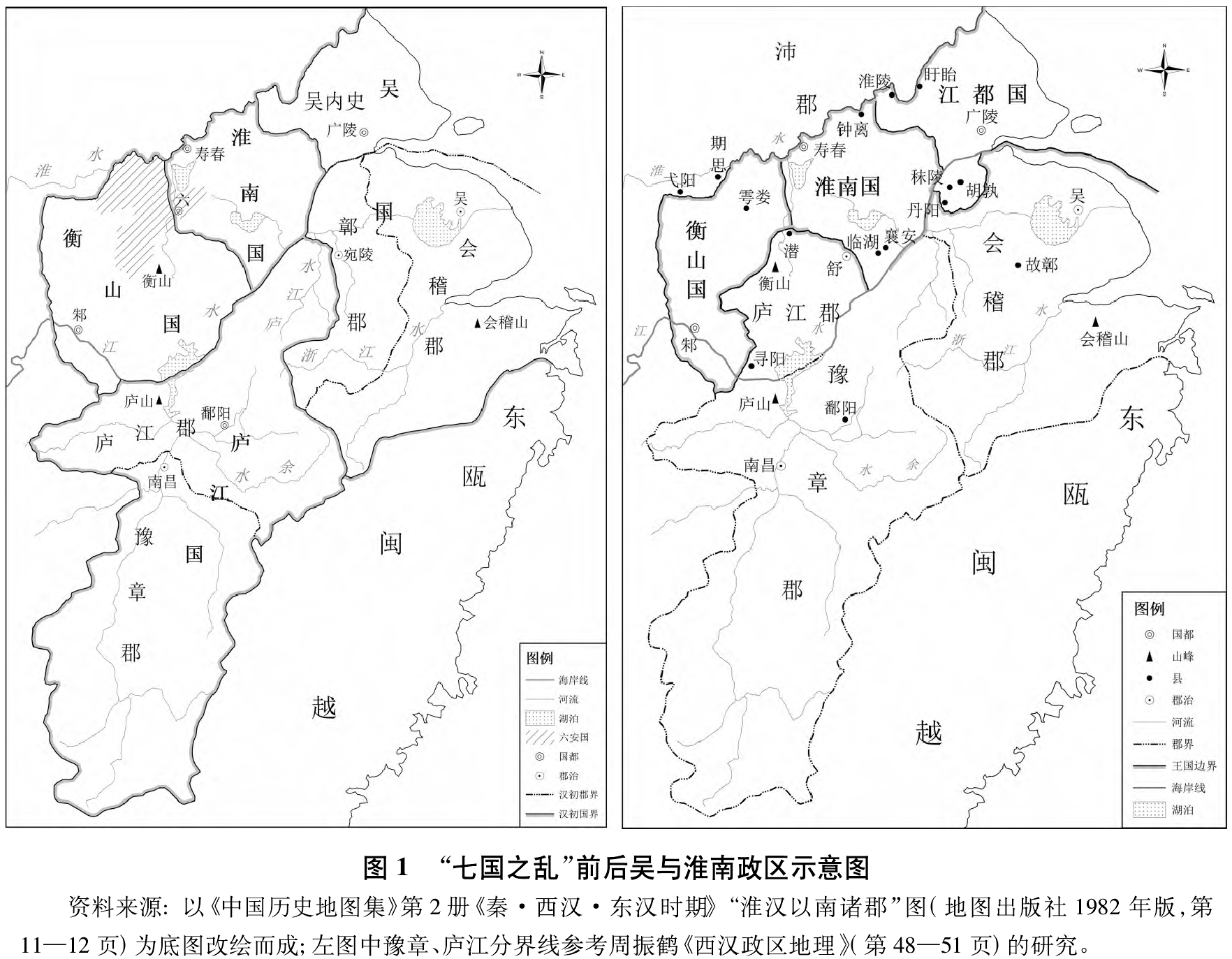 此次“收支郡”的政区调整同样波及吴、淮南二地,即引文所谓“吴、淮南、长沙无南边郡”。据周振鹤研究,淮南国最初辖九江、衡山、庐江、豫章四郡,文帝时期被分为淮南(以九江郡置)、衡山和庐江(以庐江、豫章二郡置)三国。“七国之乱”以后,景帝迁衡山王为济北王,迁庐江王为衡山王,庐江、豫章这两个南边郡就被纳入了汉土。而吴国有内史(东阳郡置)与会稽、鄣郡,后二郡为吴地南边郡,乱平后也被收入汉地。这一研究基本可以作为上面引文的详注。