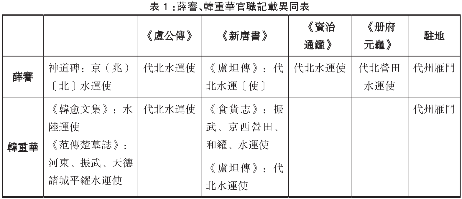 贞元中至元和中,曾掌管河曲地区黄河水运的水运使,目前仅见三例,均指向一个新的官职——代北水运使。据李翱为卢坦所撰的《故东川节度使卢公传》(以下简称《卢公传》),薛謇曾被人举发在任代北水运使时蓄异马不上献,《新唐书·卢坦传》《资治通鉴》相关记载略同。《册府元龟》又载薛謇在任代北营田水运使时贿赂宦官以求进迁。但薛謇神道碑记载的官历中只有京北水运使,并无代北水运使,且按薛謇的官历,其只有任京北水运使时才可能蓄异马。《卢公传》还记载了振武、京西水运使韩重华屯田的事迹:“(卢坦)以韩重华为代北水运使,开废田,列栅二十,益兵三千人,岁收粟二十万石。”《新唐书·卢坦传》中也记韩氏为代北水运使。但据时人韩愈《送水陆运使韩侍御归所治序》,韩重华当时应是兼掌京北屯田的水陆运使,其幕僚范传楚墓志铭中也称韩重华为“河东、振武、天德诸城平籴水运使”,《新唐书》记为振武、京西营田、和籴、水运使(表1)。