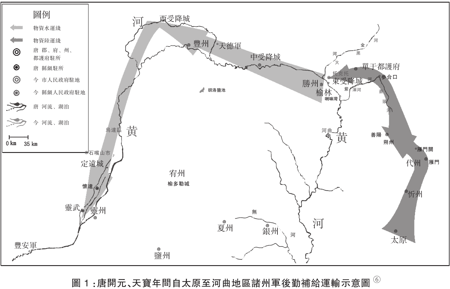 排除此三条河流,代北范围内最大可通航河流唯有黄河,因此代北水运使实际上与京北水运使一样,主要利用黄河运输。但其职责范围绝不限于代北,因为代北范围内的黄河河段不长,可通航河段更短。长庆末,度支水运营田使贺拔志因虚报振武营田数而畏罪自杀,丸桥充拓从财政机构设置方面考证应该为代北水运使,则首先振武在代北水运使管辖范围内。开成三年,度支使杜悰上奏:“水运院旧制在代州,开成二年,省司以去营田、发运公事稍远,遂奏移院振武。……请依旧却移代州。”既以振武为发运起点,说明此后勤补给运输线会延伸至振武以西沿河诸州军。又李德裕曾上书建议在胜、麟两州间设使和籴,“如万一振武不通,便改充天德军运粮使”,说明正常情况下,天德军的粮草来自振武方向。如此,在代北水运使的管理下,河曲地区黄河泝流水运线继续运作,将在河东筹措的粮草运输至振武、天德。