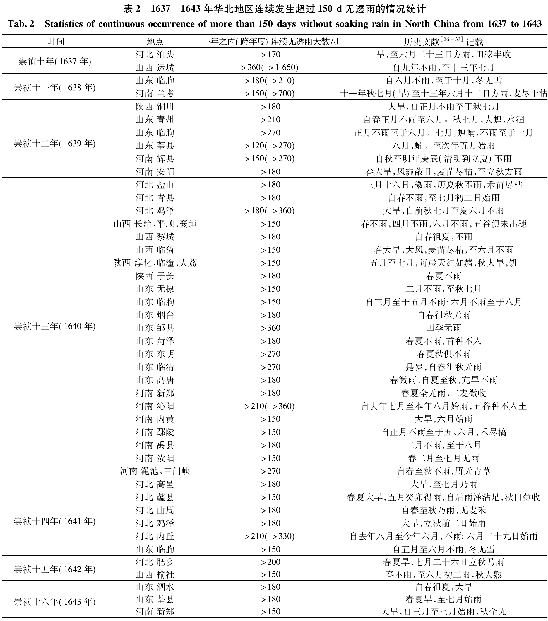 2.1.1连续无透雨日数的估算。根据历史文献记载的“不雨”和“始雨”日期,结合粮食作物受灾情况记录,对1637—1643年华北地区连续发生无透雨日数超过150d的情况进行统计(表2)。