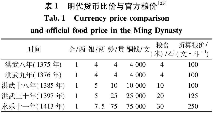1.3.1粮价通胀指数。明代金、银和铜钱的比价与粮食密切相关,货币与粮食兑换比率不是固定不变的。货币以铜钱(文)、粮食以斗为基准单位,换算粮价单位为文/斗(表1)。从1375年到1413年短短的38年,官定粮价从100文/斗上涨到250文/斗,上涨了1.5倍。可见货币的发行量远远高于粮食的供给量,粮食通胀在慢慢积累之中。