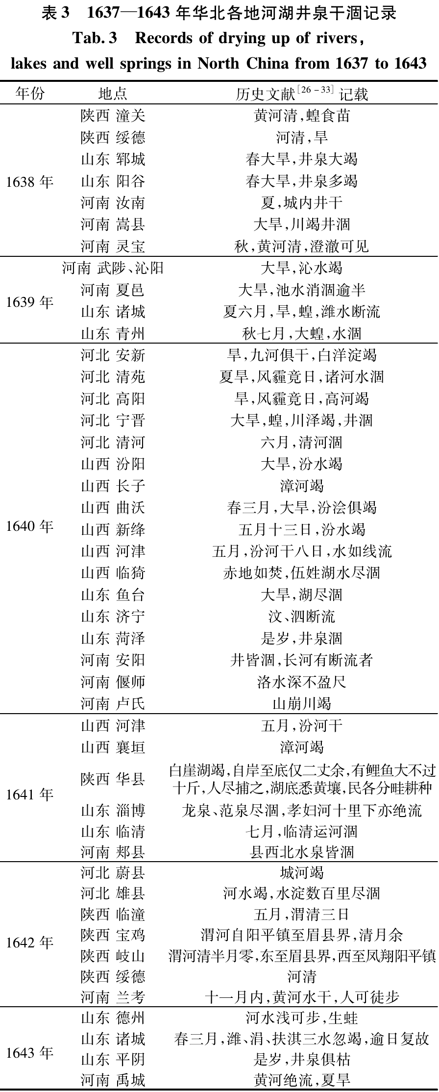 1637—1643年华北多地出现了黄河清以及众多河流、湖泊、井、泉干涸的情况。其中,汾河、沁河、漳河、大运河、白洋淀、伍姓湖等较大河流与湖泊枯竭,黄河干流甚至发生可徒步而行的情形(表3)。地表径流枯竭是这次极端干旱事件中降水稀少、旱情严重和粮食生产遭遇严重危机的重要佐证。地表水体的枯竭,表明华北地区的水循环出现了严重的失衡问题,农田不仅缺少雨水滋润,更缺失水利灌溉,导致土壤墒情进一步恶化,农业旱情加剧,最终的结果是粮食歉收,甚至绝收。