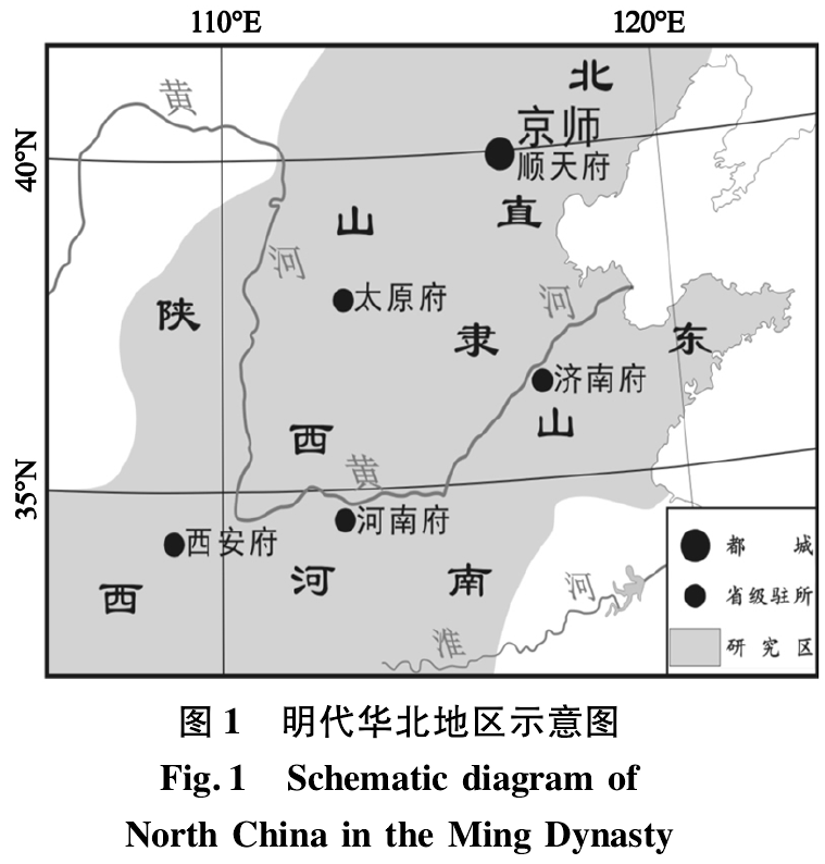 研究范围是以明代行政单元为基础的华北地区,包括北直隶(今北京、天津、河北大部、河南和山东的小部分)、山西、山东、河南、陕西等。以万历十年(1582年)明时期全图和自然资源部标准地图服务官网审图号为GS(2020)4634号的中国地图为底图,绘制完成明代华北地区示意图(图1)。该地区是明王朝的政治、经济、军事和文化核心区,为京师和九边重镇腹地,军民人口众多。自然地理单元包括黄土高原东部、华北平原大部和山东丘陵;流域单元包括海河流域和黄河中下游流域。地理位置介于32°N~42°N,106°E~122°E,冬、夏季风交替影响显著,属于半湿润半干旱大陆季风气候区,是一个气候敏感脆弱区。由于降水和气温变率大,增加了粮食生产的不稳定性,农业生态系统极其脆弱。粮食作物品种相对单一,以小麦和杂粮等为主,“小麦居半,而黍、稷、稻、梁仅居半”。
