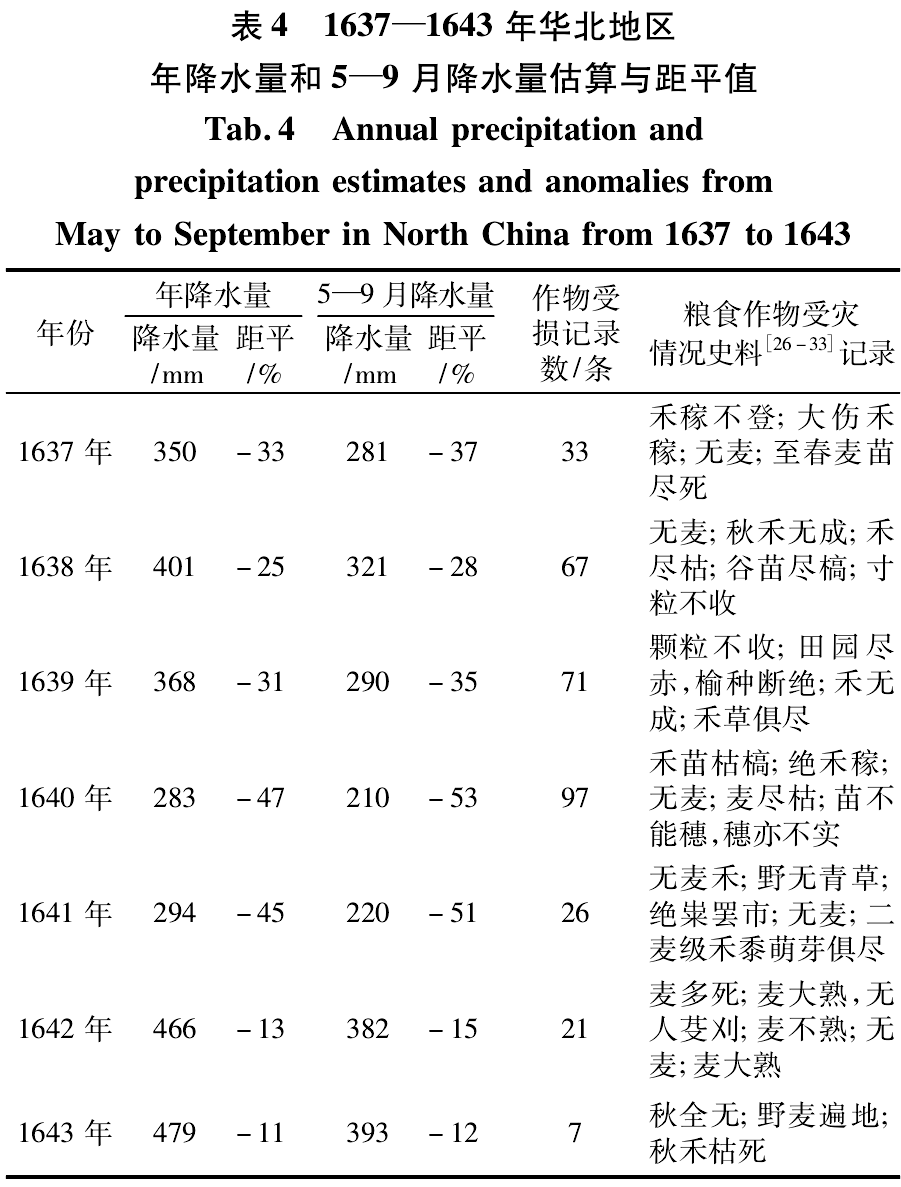 降水是粮食作物生产的主要制约因子,结合粮食作物的受灾情况,估算1637—1643年华北地区年降水量和5—9月雨季的降水量。以1981—2010年华北地区的年降水量平均值和5—9月降水量平均值为基准,计算出距平值(表4)。表4显示,所有距平值均为负值,较常年平均值从减少30%左右累加到最高减少50%以上。通过对年降水量距平值、5—9月的降水量距平值和无透雨日的变化特征综合分析,发现当连续发生无透雨日数超过150d、年降水量与5—9月降水量的距平值均≤-30%时,华北地区水分异常短缺,土壤严重失墒,造成粮食减产、歉收,甚至绝收。因此,降水量距平值≤-30%是华北地区粮食生产安全的临界阈值。
