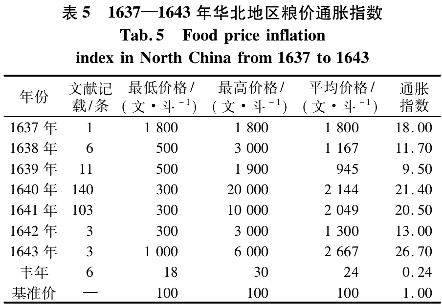 2.4.1粮价通胀指数。明代财政来源以农业田赋税为主,以税粮的方式上交,约占全部财政收入的5/6。为了维持政府和军队开支,田赋连年递增,粮饷也被折算成饷银,货币发行量与粮食供给量严重失衡。受极端干旱事件的影响,1637—1643年华北各地粮食价格持续上涨且高得离谱(1640年河南洛宁粮价为20两/斗;1643年河南新郑荞麦种6000文/斗,为明代历史最高值),年内、年际变化剧烈,出现恶性通货膨胀,给社会经济带来了灾难性的影响。