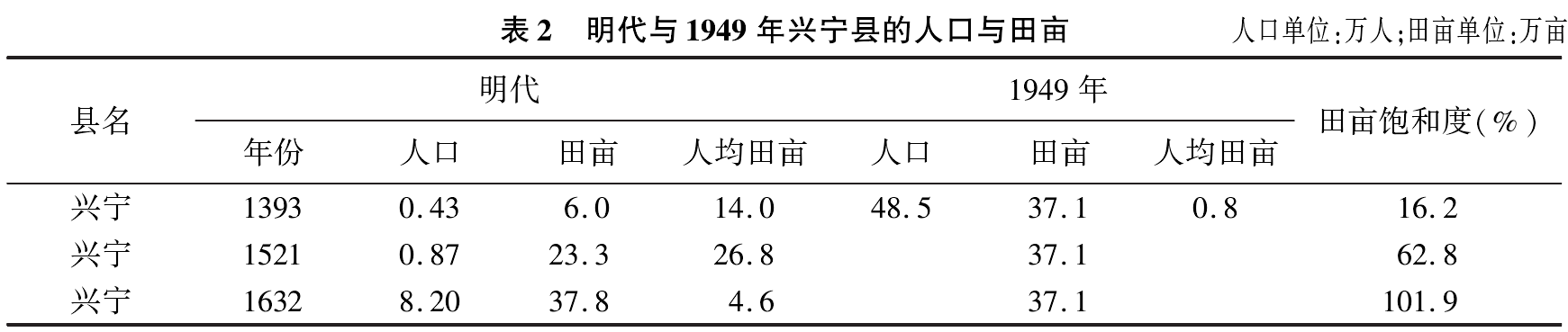 明代及1949年兴宁县的人口与田亩列如2