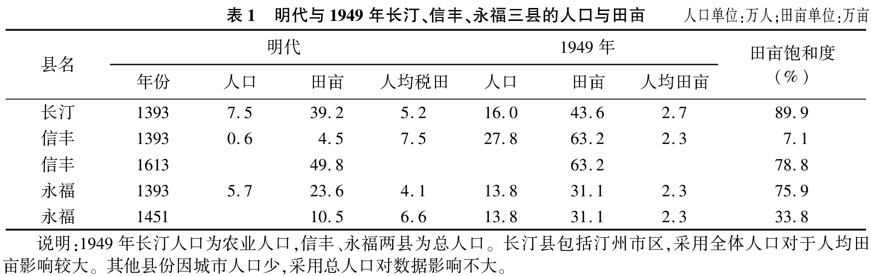 信丰(1393年)=信丰(1949年)+0.077定南(1949年)+0.099+0.667)全南(1949年)+其他信丰人口(1393年)=22.1+0.077×7.4+0.766×6.85+0.6828.6丰田亩(1393年)=49+0.077×14.4+0.766×16.8+0.263.2万亩这样,与1949年数据比较,洪武二十六年信丰县的田亩饱和度只有7.1%4.5/63.2);至万历四十一年,信丰县田亩为49.8万亩;田亩饱和度增加至78.8%49.8/63.2)(见表1)。