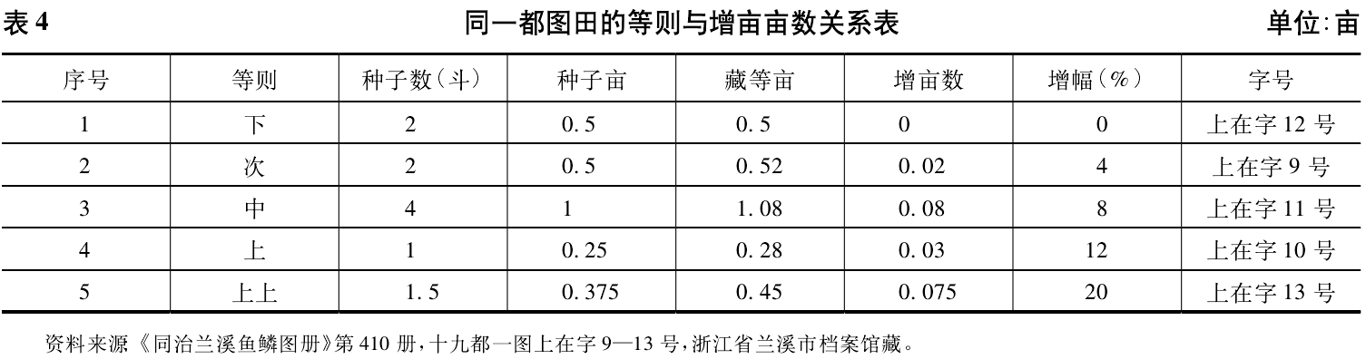在表4中,种子亩是用种子数计量出来的土地面积,标准是1=0.25亩,以“下则”每亩增亩比例为0,“次、中、上、上上”分别对应增4%8%12%20%。依据等则,增亩有固定的比例。这是整个鱼鳞图册的共同现象,此不赘述。