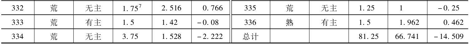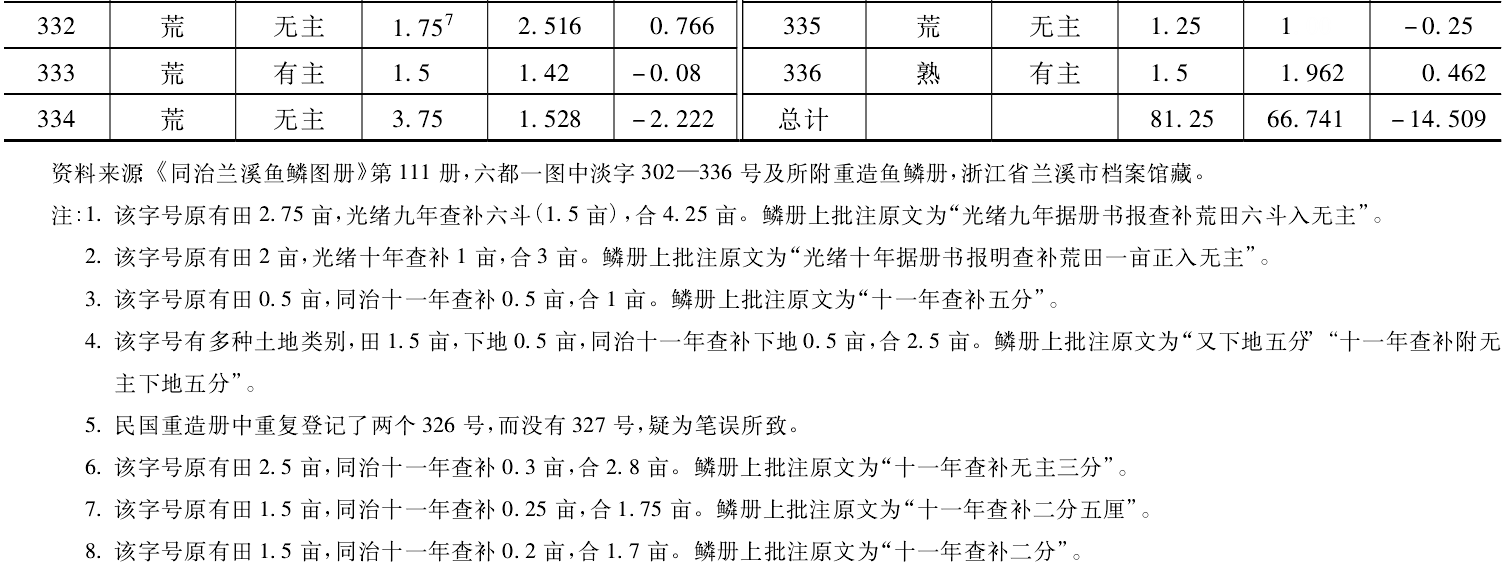 另外,据表3,民国重造鱼鳞册的丈量亩远大于旧册种子亩的306313314字号,是因为旧册所载的308号和315号,原先皆是下田,而民国重造新册时却变成了塘,其土名也从“大溪滩”变为“冷水塘(308)”和“罗卜泉(315)”。土地类别变化了,故这两号在民国重造鱼鳞册时,仅登载了其变成塘的面积。308号塘的面积为0.06亩,是一口小塘,而在旧册中为2.5亩,两者相差2.44亩。315号塘的面积为0.098亩,亦为一口小塘,而在旧册中为4.5亩,两者相差了4.402亩。这些面积应该摊入了周围的字号里。查该两号周围有3063073093133143163057个字号,由于308315号皆为无主地,根据地权属性,其应该摊入周围的无主地之中,而在其周围的7个字号里,仅3063133143个地块是无主地,所以除塘以外,剩余的6.842(2.44+4.402)亩皆摊入了此3字号中。经计算,3083153063133145个无主地号的面积,在旧册中为14.3(种子亩),而民国重造册则为14.478(丈量亩),两者的差值只有0.178亩,误差率为1.23%(0.178÷14.478×100%)。这说明上述推测较为可靠,同时也说明了种子亩与丈量亩,在理论上应是一致的,因为不管是哪种面积计量方式,在实践中总会有误差。