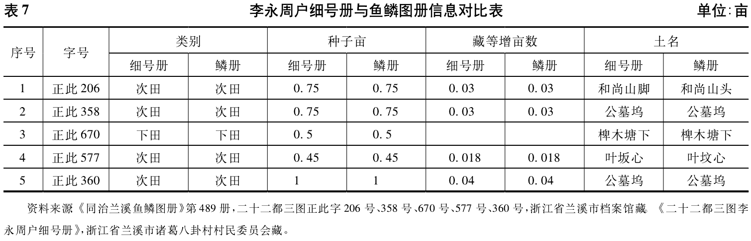 我们将细号册与鱼鳞图册所载李永周户的田一一进行对比,为直观起见整理成表7