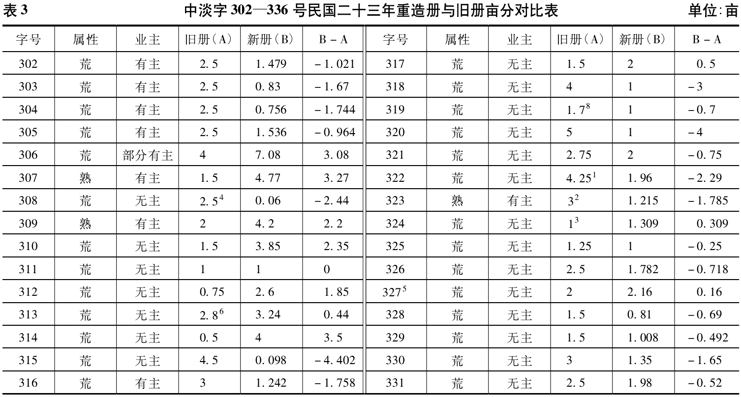 时至民国,依然用弓步丈量来核准土俗种子亩。如六都一图,共有4243个字号。民国二十三年,经丈量清查,发现中淡字302—336号,共35个字号,因地理环境变迁等因素影响,其面积与鱼鳞图册登载严重不符,为此重造鱼鳞册4张,夹于中淡字302号地块所载册籍里。这4张重造鱼鳞册的开头写道:“民国二十三年间,据六都一图推收员倪宪荣呈报,中淡字三百零二号起,至三百三十四号止(笔者注:实为336),鳞册与实地不符,错误颇多,经派员一再清丈,将前项旧鳞册废置,从新绘图编册,以符实在。”笔者比较民国重造的新册与同治旧册后,发现各字号地块面积相差悬殊,现列为表3