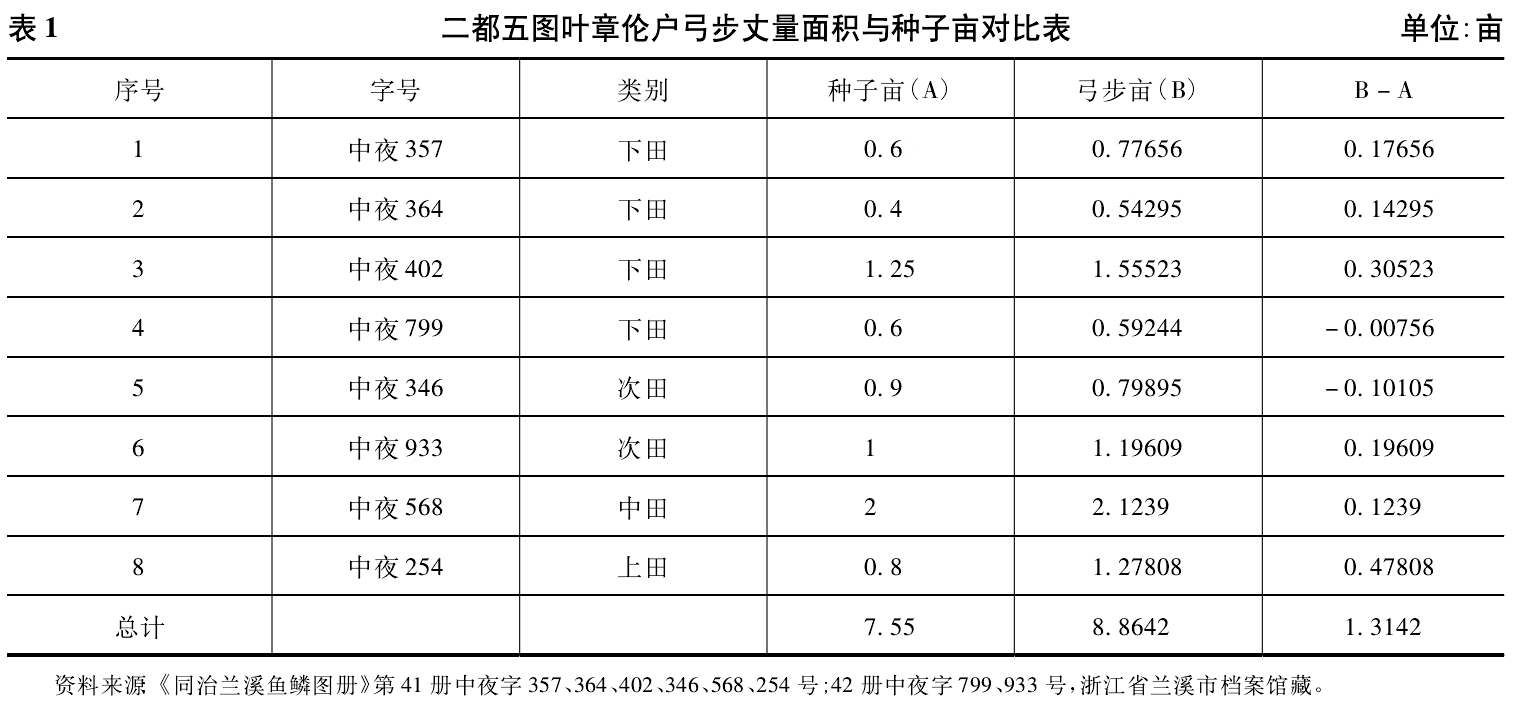 上述8个田号,最后皆用丈实的面积代替了原来的种子亩,即用弓步丈量来核准种子计亩。上述丈量情况皆以240步为1亩,是国家标准亩制,说明种子亩与国家标准亩制是一致的。一般而言,在《同治兰溪鱼鳞图册》中,只有字号信息出现错误才有更改。二都五图叶章伦户在该图共有36个田号,而进行面积更改的仅有上述8个,说明当时陈报时,该户在该图的田地漏报、瞒报、少报的数额较少。即便用这8个面积有误的田号来比较种子亩与弓步丈量之间的差额,亦相差甚小。为了直观起见,笔者现依据鱼鳞图册相关信息,将种子亩与弓步丈量的面积进行对比,列为表1
