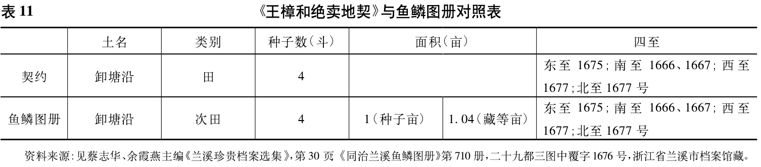 为便于理解,笔者将地契与鱼鳞图册所载中覆字1676号的信息整理为表11