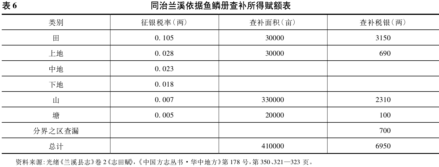 藏等亩本质上是一种纳税亩。根据兰溪诸葛村的土地交易契约文书,纳税亩在同治以前就存在了。虽然我们不清楚其所增比例,但可知种子亩与实际田的物理面积存在一定差异,如《南阳明德堂记咸丰四年十一月谷旦屋契田业总簿》中的《同治二年四月叶宇文立杜卖民田契》,记载土地归字1825号的种子数为2.5斗,若以1=0.25亩的标准,可换算标准种子亩为0.625亩,但契约上的实际纳税亩为0.67585亩,两者相差0.05085亩。不过需要说明的是,藏等于亩并未大规模改变田的总面积,因为下田、次田所占比例很大。同治兰溪政府起初并不想大规模进行查补,而希望通过藏等于亩来恢复赋役原额,但结果出乎意料,少报、漏报情况比较严重。笔者依据《清赋纪略》所载查补田、地、山、塘的粗略数据以及当时的税率,算出查补所得的银两数额约为7000两见表6