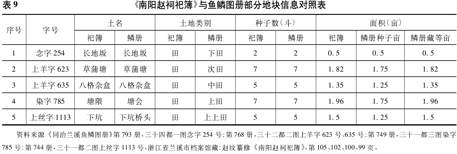 1.祀簿与族谱。族谱是聚族的重要工具,往往需要登记族产,土地自然是其中重要组成部分。从兰溪的大量族谱来看,族谱完全复制了鱼鳞图册的信息,即登记了种子亩和藏等亩,如《南阳赵祠祀簿》《高隆诸葛氏宗谱》《大经堂洪氏宗谱》等祀簿、族谱皆是如此。其中上海图书馆藏《南阳赵祠祀簿》(以下称《祀簿》),属于兰溪的大族赵氏,光绪年间由赵纹纂修,记载的主要内容是赵氏宗族在兰溪的部分族产,并且曾经“对明局册”,即与《同治兰溪鱼鳞图册》所载土地信息进行过核对。笔者统计后,得知《祀簿》所记载的赵祠祀田共有108个字号,皆注明了字号、土名、亩分、种子数等信息,与《同治兰溪鱼鳞图册》中相应字号的土地信息基本相符。经过对比,可知这108个字号田横跨兰溪5个都8个图,分布较广,其次,《祀簿》中田的亩分与鱼鳞图册不相符的只有极少数,这应是笔误等因所致。现仅以《祀簿》为例来展示藏等亩在民间的落实情况。我们随意选了《祀簿》的5个等则不同的田号,并将其与《同治兰溪鱼鳞图册》比对的信息整理为表9