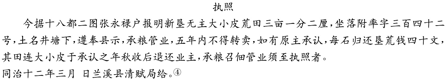 4.垦荒执照。同治、光绪年间,兰溪政府大规模招佃开垦无主荒地,并颁发垦荒执照,作为“临时地权凭据”。垦荒执照上登记的面积,便是该字号的税亩。鱼鳞图册第384册附率字342号附了一张被涂销的《张永禄户新垦无主荒田执照》,发放于同治十二年三月。到光绪十二年时,册书查明该字号属于邻县汤溪,错登在兰溪鱼鳞图册中。因此兰溪清赋局将其削除,注销垦荒执照。这说明涂销之因并非执照的内容有问题。执照原文如下: