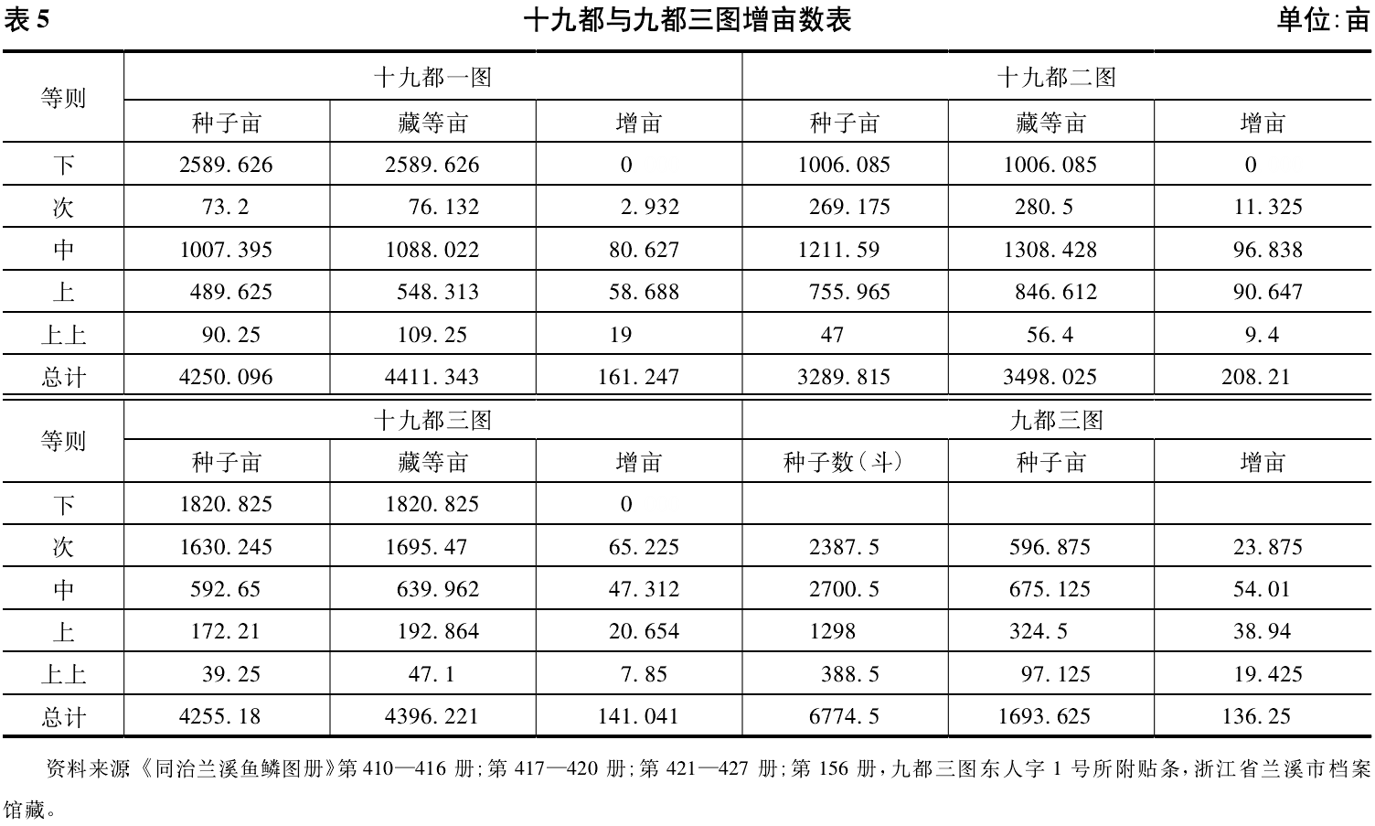 晚清兰溪清赋时,部分都图曾对藏等于亩的增亩总量进行过统计。如第156册东人字1号附有贴条,记载了九都三图从“次则”到“上上则”四个增亩等则田的种子总数。前文已经提到,兰溪鱼鳞图册攒造方式,是先记种子数,依据种子数计量田地面积,形成“实在亩分”,所以贴条记载田亩总数时,只记载了总种子数。笔者按照1=0.25亩的换算比例,算出该图各等则的种子亩,再根据其藏等亩的增亩比例,分别求得四个等则田的增亩总数,结果显示该图共增田136.25亩。由于九都三图的鱼鳞图册遗失,难以进行统计验算,为了估算每图以及整个兰溪的增亩数,笔者又统计了十九都共三个图的藏等亩增加额,具体见表5