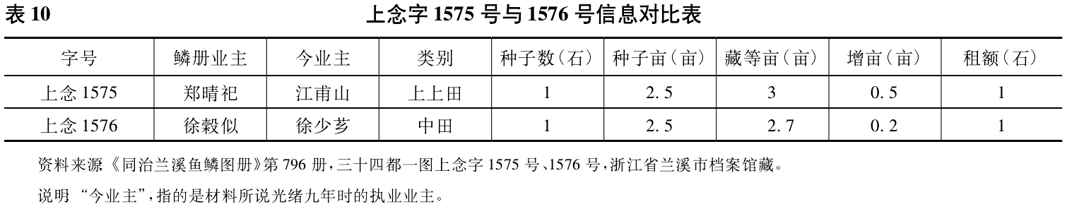 据上述贴条,因属徐姓的“上念字1576号田”与属江姓的“上念字1575号田”相邻,且种子数、种子亩、租额等皆相同,导致册书在发凭条时,将本属江姓“上念字1575号田”的凭条发给了徐姓,而将本属徐姓“上念字1576号田”的凭条发给江姓。由于兰溪的土地是依据凭条交易的,故最后徐姓错把本属江姓的“上念字1575号田”当做己田卖给了赵章汉。后来“江姓所执郑姓凭条据称遗失”,故来清赋局补办,结果发现因凭条发放错误而导致了徐姓错把江姓田当做己田卖出之事。因赵章汉与徐少芗的土地交易已经完成,很难更改,于是将错就错,清赋局将原属徐姓的“上念字1576号田”更改为江姓拥有,而将原属江姓的“上念字1575号田”更改为徐姓拥有。不过在更改过程中,藏等亩也需作出相应的变更。前面已述这两号田的种子数、种子亩、租额等皆相同,但查鱼鳞图册便会发现,本属江姓的“上念字1575号田”为“上上则”,依据等则应增面积0.5亩,其藏等亩为3亩,而本属徐姓的“上念字1576号田”为“中则”,应增面积0.2亩,其藏等亩为2.7亩,因藏等亩不同,故有“册书将江、徐二户亩分增减过户”的举措,也就是把“上念字1575号田”与“上念字1576号田”的藏等亩等信息互换,以符合鱼鳞图册登载总亩数不变,这充分反映了藏等亩也要落实到土地交易中。为了直观起见,笔者将这两号田在鱼鳞图册以及贴条上的信息列为表10