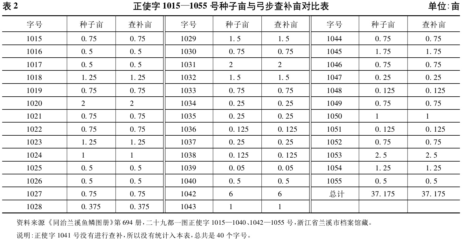 另外,在查补过程中,政府查核了面积信息可能有误的田地,若发现陈报时的信息无误,便删去误补的批注,仍保留原来的陈报数据。如《同治兰溪鱼鳞图册》正使字1015—1055号,位于二十九都一图,连续40个字号,都是下田或下地,每个字号皆标明了种子数和种子结实亩(面积)。这40个字号,开始皆用弓步丈量对种子亩进行过核准,故每号田地都有批注。批注的表达形式是“(同治)十一年查补若干亩若干分若干厘若干毛”。后发现这些查补亩分与种子亩完全一致,不需要进行批注说明,于是又将这些批注全部涂删了。如正使字1015号,批注为“(同治)十一年查补七分五厘”,而该号陈报时的种子结实亩也是“七分五厘”,毫无差错,于是政府删去批注,并在该字号的种子亩处加盖印章。印章是骑缝章,印章上的文字为“念玖都壹图清赋局”,表示核查者为该图清赋分局,其他各字号的情况皆可类推。笔者现将上述40个字号的田地种子亩与弓步查补亩的对比列为表2