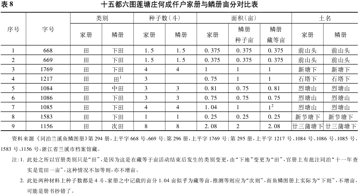笔者对照上述鱼鳞家册与兰溪鱼鳞册(鳞册)所载信息,制作成表8,以便一目了然。