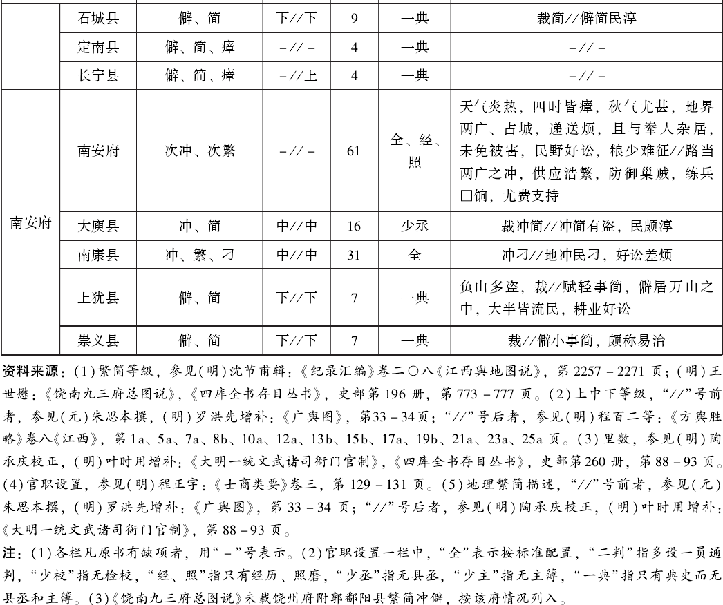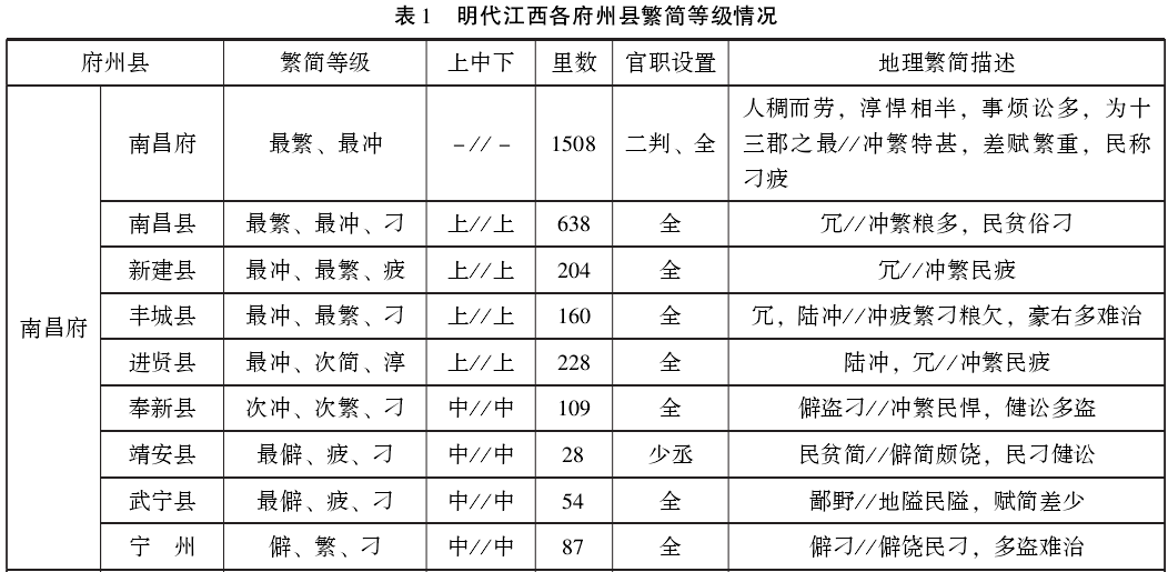 早在明朝建立前的壬寅年(1362),朱元璋政权就建立了江西行省,在与陈友谅的不断战争中,江西行省的面积不断扩大,到洪武初已有13府。洪武九年,明朝改江西行省为江西承宣布政使司,下辖68县。明中叶以降,陆续增设10县,并改南昌府所属宁县为宁州,到万历六年时,13府共辖1属州、77县。为使读者对江西各府州县的繁简等级情况有一个比较全面的了解,并便于进行统计分析,兹将散见于上述各书中的相关信息择要汇列为表1。表中各栏信息并非来自同一年代,最早的《广舆图》初刻于嘉靖后期,最晚的《士商类要》刊刻于天启年间,其余各书均刊刻于万历年间。但通过对不同时代的同类信息加以比对,基本上都是大同小异。可以说,表中各项信息基本上反映了明代后期江西各府州县的地理繁简和职官设置的常规情况。
