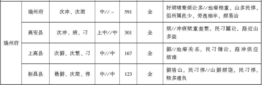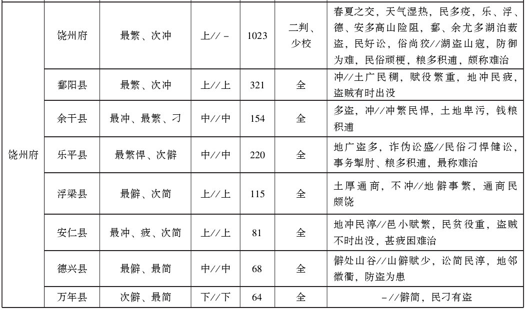 得益于《江西舆地图说》与《饶南九三府图说》,加之参考全国性典籍中的江西部分,我们可以对明代后期江西各政区的地理繁简和上中下等第情况了解得更加清楚一些。江西13府共辖1州77县,其中带“繁”字者31州县,带“冲”字者43州县,带“刁悍疲”字者40州县。将政务繁简、道里冲僻、治理难易等因素与上、中、下等级进行对比,可以看出两者之间确实具有一定的对应关系,但这种对应并不严格,说明政区等级评定是个非常复杂的问题,无论采用何种标准都很难一律适用。