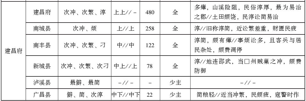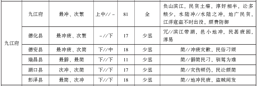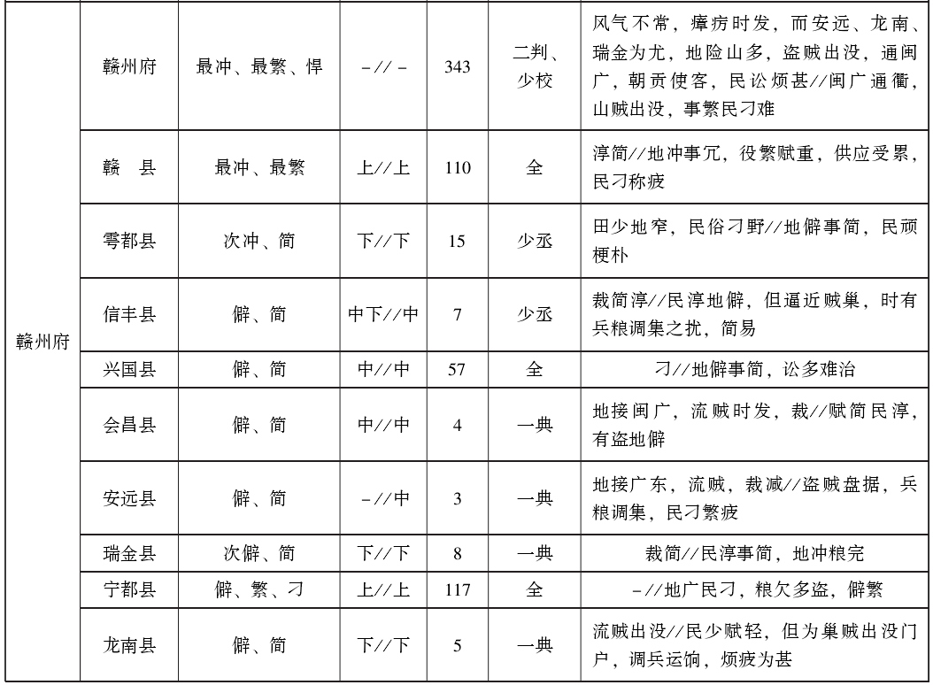 在表4中,广信府、建昌府、赣州府各有1县缺少等级信息,其余州县均是两项具备。可以看出,繁冲刁悍疲与上中下等级之间确实具有一定的对应关系,比如占两个“最”字(即2+2+1和2+2)者共有8县,除1县为中等外,其余全部为上等。但这种对应并不严格,例外情况占比很高,甚至有的非常不协调,如九江府德化县“最冲疲、次繁”,等级为下,而赣州府长宁县“僻、简、瘴”,等级却为上。相对说来,官职配置、繁简等级与上中下等级之间的对应关系更加明显,当然也有一些例外。参照表1中的官职设置情况,如果按照表2所说赋值原理统计,在江西78个州县中,2分及以上者共有39个,其中正官和首领官都配备齐全者37个,首领官缺员配置者2个。1分和0分者也是39个,其中正官和首领官都配备齐全者15个,首领官缺员配置者24个。表1中标明上中下等级的州县共有74个,各等级官职设置情况为:上等24个,其中正官和首领官都配备齐全者23个,首领官缺员配置者1个;中等31个,其中正官和首领官都配备齐全者23个,首领官缺员配置者8个;下等19个,其中正官和首领官都配备齐全者5个,首领官缺员配置者14个。