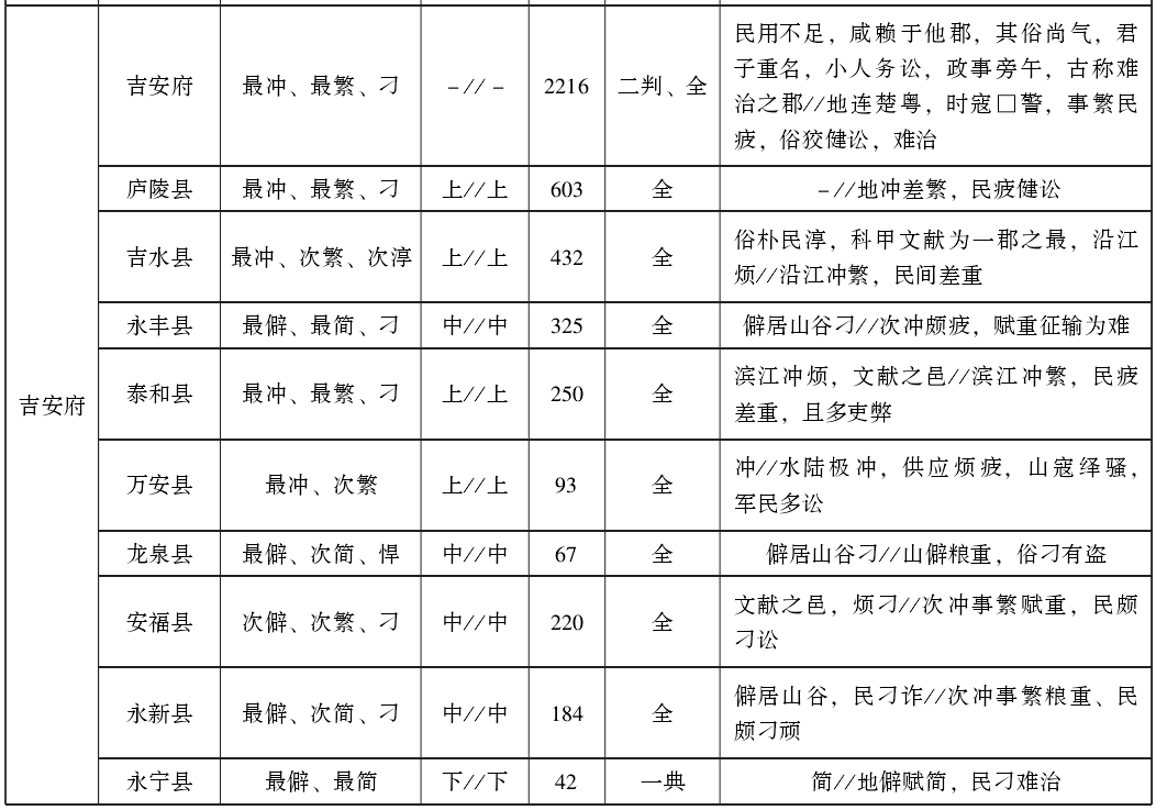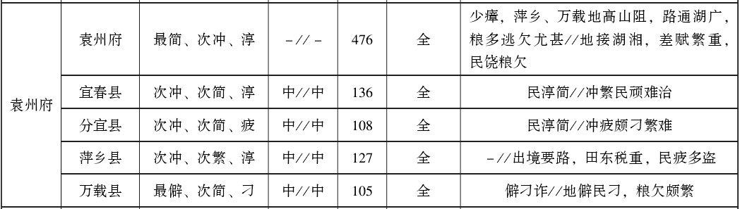 关于繁简冲僻刁淳等因素在各府的具体分布情况,详见表3。在1州77县中,有31州县带“繁”字,约占40%;43州县带“冲”字,约占55%;40州县带“刁悍疲”字,约占51%。按各府所辖州县带“繁”字者所占百分比排列,南昌为75%,建昌为60%,吉安约为56%,临江为50%,饶州和广信均约为43%,抚州和瑞州均约为33%,南康、南安和袁州均为25%,九江为20%,赣州约为17%。按各府所辖州县带“冲”字者所占百分比排列,临江为100%,广信约为86%,九江为80%,南昌、南康和袁州均为75%,建昌为60%,南安为50%,吉安约为44%,饶州约为43%,抚州和瑞州均约为33%,赣州约为17%。