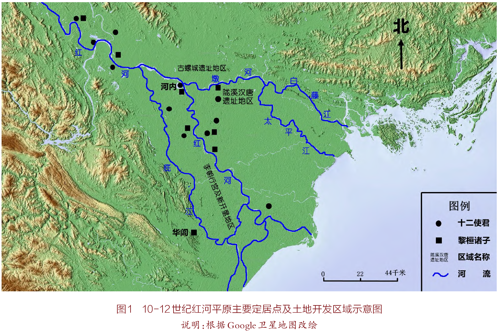 另据考古发掘显示,红河平原汉墓遗址主要分布在“平江水系的白藤江及其上游天德江两岸地区,在行政区划上属于今广宁省、海阳省、北宁省和河内市的范围,平江两岸、红河两岸、禁江东岸、富农江北岸也有少量汉墓分布”。事实上,汉唐之际中原王朝到红河平原主要的交通线,也是由海路至白藤江,转陆路或水路溯流而上进入红河平原中心地区。由此可以看出,1纪以后红河平原人类活动区域开始扩大到下三角洲沿河高地,而红河平原早期的政治中心古螺城也位于这一地区。在地质学上,古螺遗址要分布于红河平原海拔5-7米左右的天然堤坝,与前述河内地区在地质上同属天然堤坝与更新世台地之间的高地,因此可较好地避免海侵和洪水的影响,从事基本的农业生产。同样,在红河支流水系河南岸的陇溪汉唐时期遗址进行的考古发掘,发现大量汉代墓葬和城址遗迹,与古螺城遗址隔河相望。墩河两岸地区的汉唐考古发现表明该地区已形成了较为密集的人口定居点,也构成了汉唐之际红河平原重要的政治活动中心。根据声波的研究,唐末安南都护“领峰、武定、谅、陆、苏茂、武安、郡、长、爱、演、驩、唐林”十二正州,治安南府。按其对各州治所和辖域的考证复原,安南府直辖各县大都分布在红河、墩河、白藤江、平江等流域高地,表明至9世纪末,红河平原的人口及土地主要集中区域与前述红河平原的各类考古发现和遗址分布仍大体吻合,显示出10世纪以前红河平原人活动区域和定居点的稳定性和延续性(见图1)。