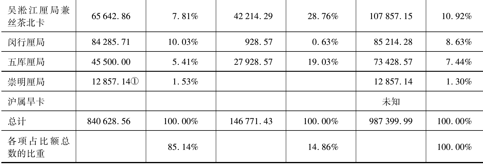清末沪局厘金比较坐额有以下特点:(1)财政说明书记载征收名目仅有货厘和米厘,并无茧捐名目;货厘占比较总额的85.14%,米厘仅占14.86%。(2)上海百货捐局占比最高,占货厘比较总额的55.85%;吴淞钓船捐局、闵行厘局分别占货厘坐额的8.08%和5.41%。(3)沪局各局米厘坐额基本由上海百货捐局、吴淞江厘局兼丝茶北卡和五厍厘局三者抽收,三者米厘分别占米厘总数的50.70%、28.76%和19.03%,仅有少量米厘由刘河厘局和闵行厘局抽收。上海百货捐局占货厘与米厘之和,占总额的55.08%;吴淞江厘局兼丝茶北卡、闵行厘局、五厍厘局及吴淞钓船捐局所占比重较高,四者分别为10.92%、8.63%、7.44%、6.88%。