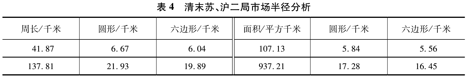 基于府级厘局与厘卡所生成的泰森多边形差异,与施坚雅模式条件下的区域市场分析不尽相同,这种差异源于区域市场内空间载体属性的差别。根据ArcGIS工具泰森多边形的运算,以改绘图幅为基础,苏南市场厘卡分割的市场空间,取较为理想条件下的圆形和六边形为准,以已知的周长和面积反推相应条件下各分割市场半径的值(表3),可知清末苏南厘卡半径范围为5.56—6.67千米,府级厘局半径范围为16.45—21.93千米(表4)。