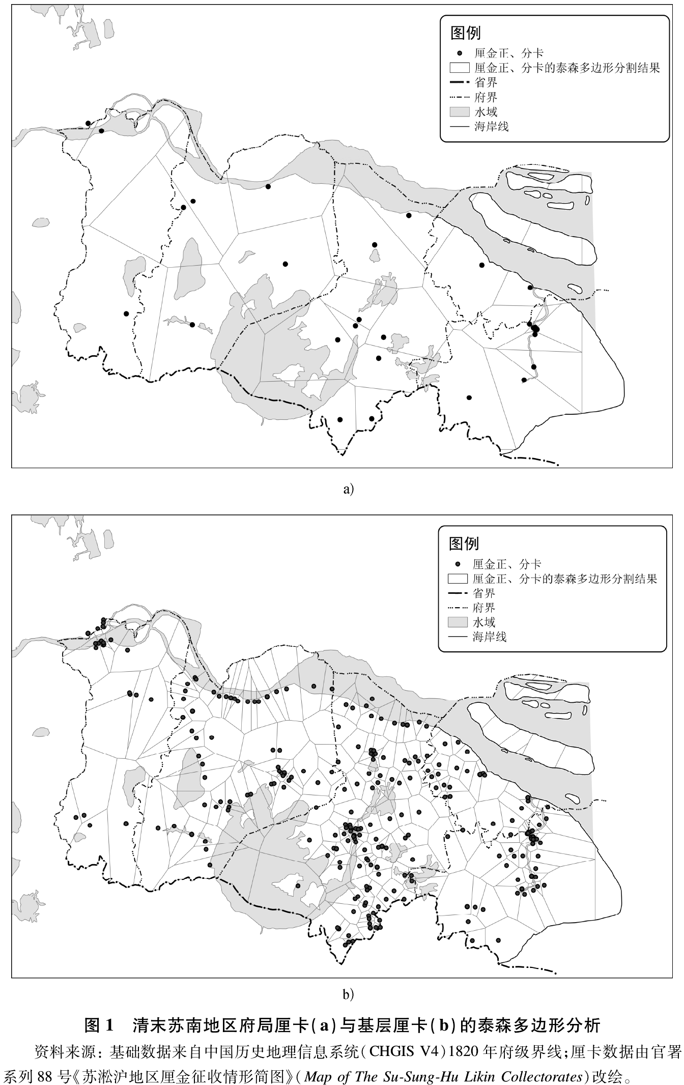 绘制结果(图1)基于官署系列88号《苏淞沪地区厘金征收情形简图》(图2)得出。由于泰森多边形边界受不同层级点状数据及图层空间范围的影响,分析结果有所差别,特别是靠近边界地带的形态。核心区的生成结果不受边界范围影响。基于府级厘局与基层厘卡所生成的泰森多边形结果并不重合,这种分析结果在广泛意义上表明地域载体对空间的分割,部分反映厘金局地方市场问题的地域特征。