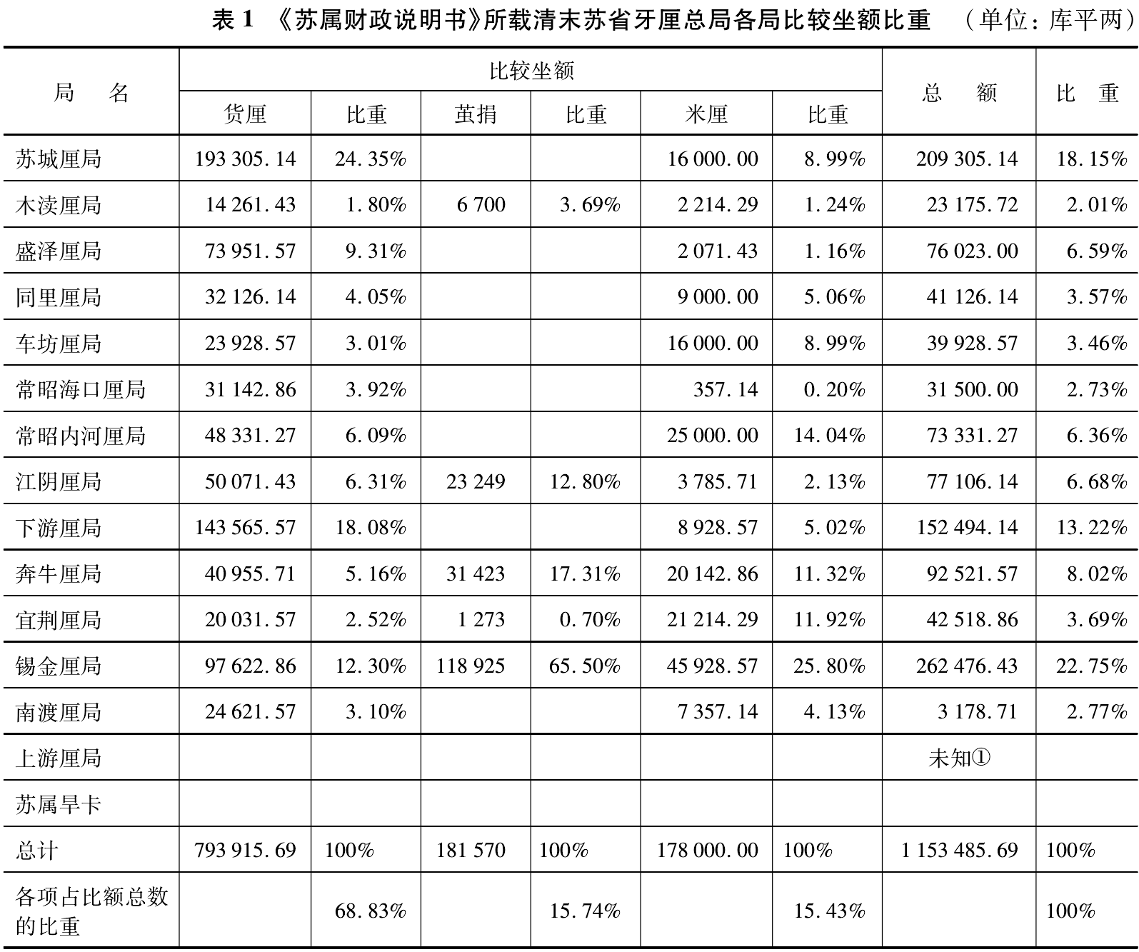 江苏所定比较坐额的过程,财政说明书并无明确记载,暂以浙江比较坐额实施情况为参照。浙江厘金抽收,在同治年间并无具体办法。光绪元年(1875),浙省以该年收数为准,以盈绌定委员去留功过。后改为以前三年收入均数为准,但商情变化较大,各卡连年收数短绌,额度稍有下调。光绪十二年(1886),复改用光绪十年(1884)收数;十七年(1891),又规复匀三提一的办法,各委员屡以层累叠加,请改减比额。二十三年(1897),恽祖翼对浙江厘务进行改革,重定浙江比较章程,改用近六年收数最多之年为比较坐额,核定常年比额清册立案。从比较坐额演化过程来看,清末江南地区比较坐额是数年征收额度均数,大致反映了该地的经济发展水平。表1和表2分别列出了清末苏、沪两省各局比较坐额比重。