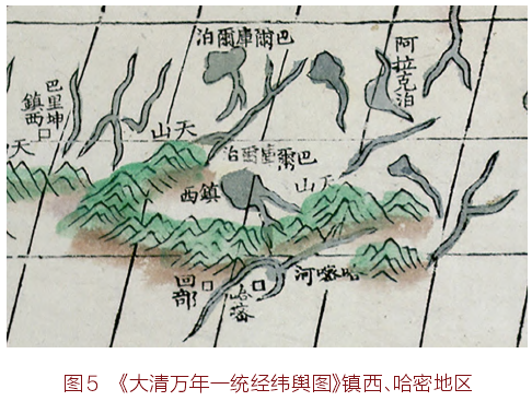 借助《大清万年一统经纬舆图》的颜料特性,可初步判别舆图内诸要素的绘制顺序,谨以镇西、哈密一带为例(见图5):