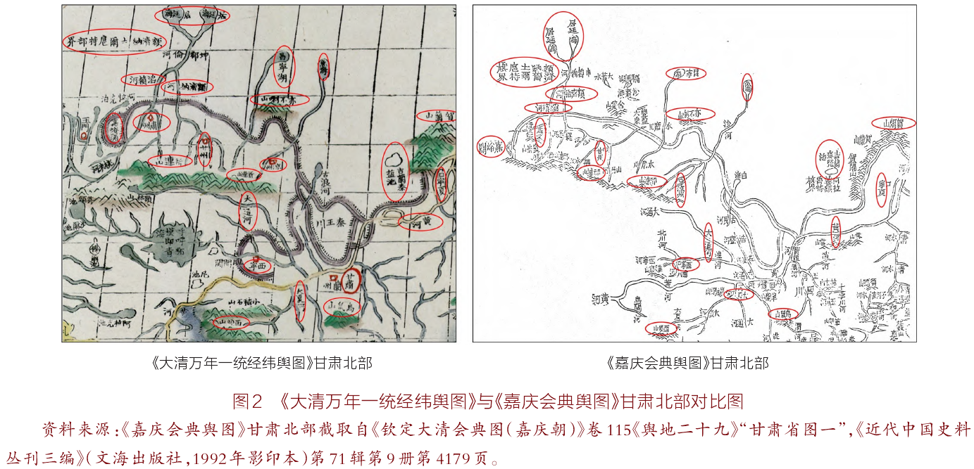 分区域对比《大清万年一统经纬舆图》及《嘉庆会典舆图》可知,两者在地名书写、山川走势、政区坐落、各省边界等方面皆高度相似。囿于篇幅,本文无从对各地区进行逐一分析,谨以甘肃北部为例,红圈标识即两者绘制的相同之处(见图2)。
