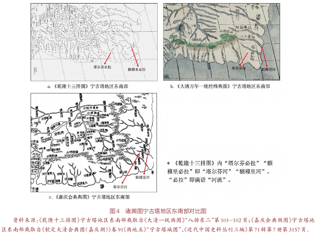 前已述及,《大清万年一统经纬舆图》该区域的河流绘制袭自《乾隆十三排图》,但两者“塔尔芬河”的位置却不相同,其在李明徹舆图内居偏东20-21度间,在《乾隆十三排图》内则居偏东19-20度间。观察各舆图可知,此误差的出现是因李明徹先按《乾隆十三排图》绘制海岸线及河流,后据《嘉庆会典舆图》题写地名,但李明徹未加细究两种舆图投影的对应关系,而误将“塔尔芬河”标注于“额穆里河”处。