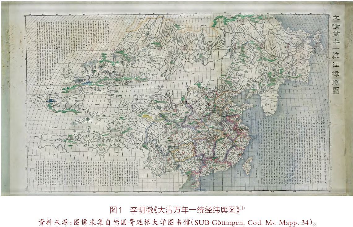 德国哥廷根大学图书馆(Göttingen State and University Library)藏有清代广东道士李明徹所绘《大清万年一统经纬舆图》(见图1)。早在1832年,英国东印度公司职员马儒翰(J. R. Morrison)便在《中国丛报》(Chinese Repository)首卷上撰文,以该舆图为切入点,介绍清朝的疆域地理。不少学者因此文知晓《大清万年一统经纬舆图》,却始终未能得见,只能凭借马儒翰有限的描述进行想象。2014年,法国科学院研究员Dorofeeva-Lichtmann Vera受馆方之邀,在一批未整理著录的地图中发现了它,该舆图才得以向学界公布。