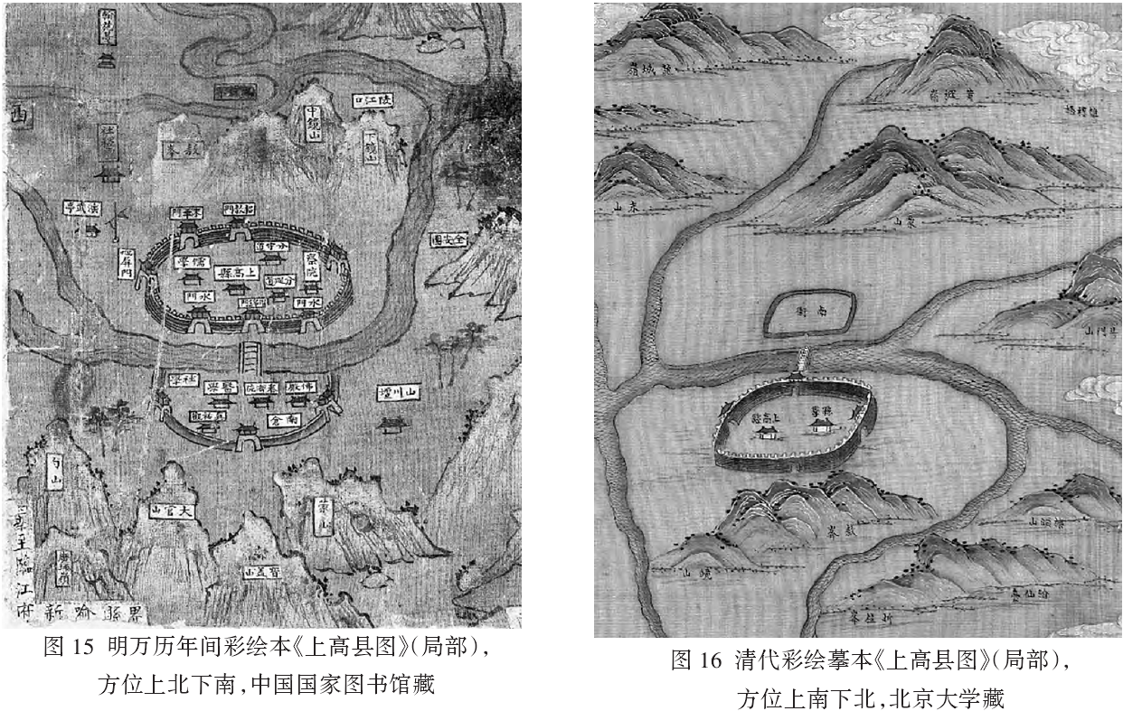 上高县城,城址坐落于今江西省锦江中游低山丘陵间的高地上,南临蜀江(即锦江),“新昌、万载四幅之毂”。县城北倚敖峰、镜山,城东屏山连亘,城南隔江有蒙山、大官山,城西坐拥柘湖山,“山下坦夷,蜀江水涨,弥漫如湖”。明万历年间彩绘本《上高县图》(局部,图15),方位上北下南,江北县城画椭圆形城垣雉堞,开5座城门、2座水门,城内标记“上高县”“分巡道”“分守道”“察院”“儒学”等官署;蜀江南岸画半圆形城垣无雉堞,城内注记“南仓”“养济院”“医学”“社学”“佛殿”“真佑观”。清代彩绘摹本《江西舆地图说》之《上高县图》(局部,图16),方位上南下北,描绘上高县城(仅注记“上高县”“县学”)与蜀江南岸的“南街”镇,两城之间以一桥相通,“平政桥在上高县治西,跨蜀江上,旧名通济。宋开禧中易名浮虹,后更名望仙。嘉熙中,徙县前,易名济川。元至治初,复徙县西。明初改名平政。本朝康熙中复圮,乃徙而东;后以往来不便,复还旧所”。平政桥之所以反复迁建,盖因蜀江东流受上高县城周围山岗阻滞,形成弯流,河道多次迁徙,如今从卫星影像上仍能辨认出枯涸断流造成的旧河道牛轭湖。上高县城南平坦,诸溪汇入蜀江,西南通袁州府万载县、分宜县,东北接瑞州府高安县,系驿路所在,水陆往来民商聚集,居停买卖促成繁荣,因此,自宋代以来就在蜀江南岸逐渐形成市街。据《上高县志》卷十《艺文·议修青阳门石桥序》载:“上高中贯河水,县治居河之北,而河之南壤尤广袤,士庶工商之所辐辏,势不能一息不往来其间。”这反映了上高县南北双城间交通之频繁与紧密。而两城功能各异,锦江北岸的县城属于政治管理型区域中心城市,南街则属于商业型市镇。