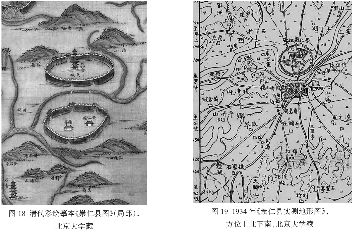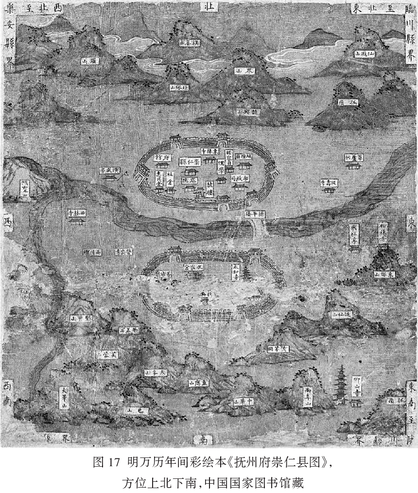 崇仁县属江西抚州府,地处赣中丘陵向赣抚平原的过渡地带。县城三面环山,一面临水。仙游山居县东北,龙兴山卧县正北,东塔山处县东南,北塔山在县西北,崇仁河自西向东呈U形环绕县城,分县城为南北两城。史载:“宋祥符间有城,周不及一里,后废,盖因县治瞰溪,难施板筑也。”据1958年以前南城矗立着皇祐二年(1050)重修的太和寺塔推知,宋代崇仁县城址曾位于河南岸,因河滩积沙多,难以板筑城垣。明嘉靖四十一年(1562),于河北岸新筑县城,周回4里余。明万历年间彩绘本《抚州府崇仁县图》(图17),方位上北下南,描绘南、北二城,北城的南城垣外画棕褐色高岸,与南岸明显有别,说明崇仁县城已经移建于崇仁河北岸高耸之阶地;城内标绘“崇仁县”“按察司”“布政司”“察院”“儒学”“城隍庙”“府馆”“社仓”“东林寺”,集中了明代县治各类衙署,属于行政官署型治所城市;崇仁河上画德平桥,桥南画南城,城内标记“水次仓”“太和寺(塔)”“善修观”等,应属于集中了商业、手工业店铺与民居的市镇,所以,清代彩绘摹本《崇仁县图》(局部,图18)标为“民城”。