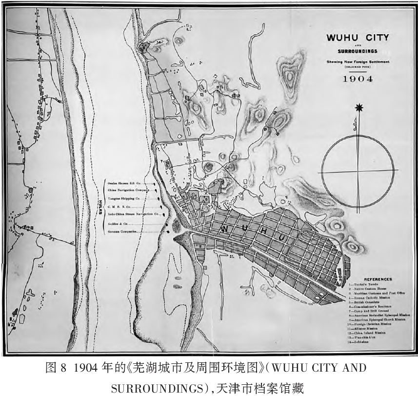 1904年的英文《芜湖城市及周围环境图》(图8)系根据1902年中英签订的《芜湖租界租地章程》由外国制图师绘制,纸本彩印,用晕滃法表示地形,纵33.6厘米,横39.6厘米,表现了青弋江口的芜湖老城、十里长街、长江码头的街道规划。图上用粉色显示陶家沟以北至弋矶山之间新的外国人居留地,沿江7个黑色标记用以表示日本三井船业、英国怡和、英商太古轮船、扬子江轮船、德国商会等公司的储货船位;另外,还用数字标记了道台衙门、英国领事馆、天主教耶稣会、美以美教会等。虽然新的外国人居留地还未建成,其与芜湖老城的位置关系已经清楚地画在地图上了。