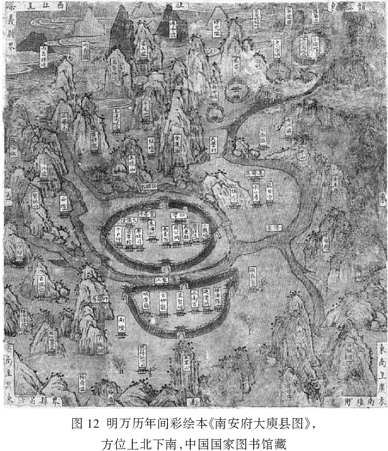 大庾县城属于江西南安府的附郭县,今为江西省大余县。城址四面皆山,南濒章江,跨章江即南入广东之大庾岭路。大庾故城在县城西南,西汉时南粤王反叛,武帝遣主爵都尉杨仆为楼船将军,出豫章,下横浦,复通大庾岭路,筑城于此。唐中宗神龙元年(705)置大庾县,治东山脚下。北宋淳化二年(991)置南安军,始移筑今县治。章江,又名横浦,出县西北聂都山,蜿蜒而东流至大庾县城南,受东山所阻,向东北回转形成湾流,旋又为狮子山所阻,复转而南流。宋南安军城垣因章江之势而呈圆弧形。元朝时章江水大改流,从西门入、东门出,直穿城中,遂形成一水中分、双城对峙的格局。至元二十九年(1292),在水北岸改筑新城,不久倾圮。至正十二年(1352),再修新城,次年甃以砖石。明朝沿用新城设置为南安府城,屡经拓修,南濒章江,城垣周回四里余,呈横椭圆形,当地人称“鱼城”。明万历年间彩绘本《南安府大庾县图》(图12),方位上北下南,城内标绘“南安府”“大庾县”“岭北道”“布政司”“清军馆”“千户所”“大备仓”等官署,以及“社学”“周公祠”“东海祠”“宝界寺”“小校场”。