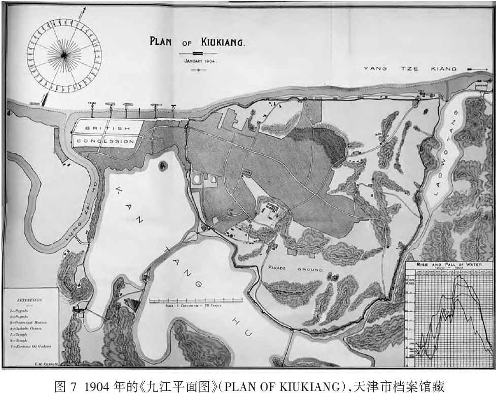 二是九江府城与英租界。根据咸丰八年中英《天津条约》,九江被开放为通商口岸。咸丰十一年(1861)签订《九江租地约》,划定九江府城西门外,自龙开河口向东,至狮子口西侧十三丈止,为英国租界。1904年1月,艾克赫夫(E. W. Eickhoff)绘制《九江平面图》(图7),纸本色印,用晕滃法表示地形,有图例,比例尺1厘米合75码,纵44厘米,横54厘米,表现了九江开埠后设立英国租界的扬子江码头、规划过的街道,反映了山丘、长江、龙开河口、九江府城、水塘与租界的位置关系。英租界所在地曾是长江靠岸沙洲,龙开河口旧称“湓浦港”,自明代以来一直是江船避风泊地。龙开河口东侧的沙洲受长江江流冲刷侵蚀,逐渐淘深,正适合选建现代港口码头。当年英国人正是看中这一有利的地貌条件,修建了港口码头、仓库、洋行,划为租界,租界内的十字形街道显然是经过规划的。