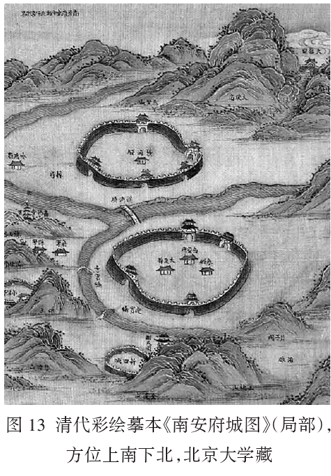 清朝,南安府城续有增修,仍分为水北老城和水南新城两部分。北城容纳府、县衙门及府学、县学等官署;水南新城为民城。两城间仍以横浦桥相连。清代彩绘摹本《江西舆地图说》之《南安府城图》(局部,图13),方位上南下北,北城标绘“南安府”“大庾县”“参将”,南城仅标记“横浦驿”,南门“驿使门”外即通大庾岭梅关驿路,能够反映出双城的功能差异。