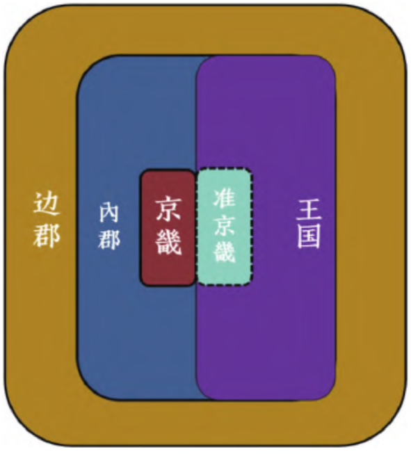 如果分析太初年间以后的王国地域分布,便不难理解这一现象。在元封、太初年间逐渐形成京畿—准京畿—内郡—边郡的政治地理结构后,汉廷分封诸侯王国皆以内郡改置。不仅如此,侯国的封置也在内郡范围里。“内郡”实际成为“封国”形态存在的唯一地理单元。这种地理分布态势决定了王国拥有与“内郡”类似的政治地理地位。由此看来,太初改制后的国家政治地理圈层结构应为京畿、准京畿—内郡、王国—边郡(图6)。