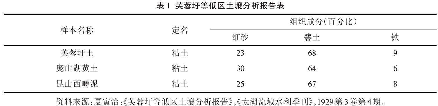 在特殊的地理环境下,芙蓉圩形成了独特的土壤与农业景观。长期的湖泊形态使得该地区地下水位较高,导致土壤颗粒稀疏,难以保持水分和养分,其土壤为典型的漏水水稻土。当地文献记载,“湖中土性朽腐,旱不盛水,一溉即渗漏田底,随戽随涸,最无救济之术。”又有记载云:“壤性朽腐,注水若漏巵,旱又可虞。”围湖成田后由于长期农业耕作,土壤成分与结构发生新的变化。在不同的微地貌区域,因地势高低状况有所差异,从圩田的边缘到中心,地势逐渐降低,每年淹水时间也随之增长,土壤中滞水现象严重,透水透气性差,演变成为典型的滞水水稻土。清人吴兴祚曾记:“通圩六十里之内,东南一隅属于锡邑者尤为洿下,岁产一熟,名为不麦低田。父老谓余言曰:去年被渰,今复继之。高乡获四五稔,而此处一熟未收,未知将作何状。”此记述已经指出其土壤特性与地势的关系,民国时期的种麦调查也证实了这一差异,“高区岁获稻麦二熟,低区一熟者称为不麦”。同一时期所做的土壤化验分析报告认为:“此种土壤,粘着力颇强,不易耕锄,亦难透气与水,腐殖质、燐酸及窒素(氮),尤见缺乏,宜混粗松之土,方能合用。除豆科作物之外,宜混用少量之石灰,然后有硝化之效力。”邻近大围岸的土地,因靠近村庄和河浜,长期挖河挑土、施用河泥及施用各类肥料便利等原因,较他处更为肥沃,且地势较高排水良好,水稻、小麦等农作物均能良好生长。对种麦情形的调查,也反映了地势差别对农作物生长的影响,“该圩沿堤田亩,地势较高,以现状观之,麦杆高可及胸……盖圩外田底为黄土,圩内为黑土,麦根入土较深也。(低区)虽种麦,以受水淹之故,不甚茂盛,原因皆由泄水困难所致。”其土壤构成状况(见表1)。
