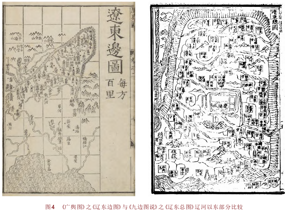 霍冀列举的此4项确实是《广舆图》的特点,也是《广舆图》在中国地图史上具有重要地位的部分原因。但霍冀在担任兵部尚书之后主持编绘的《九边图说》中,既没有使用计里画方,也没有使用与《广舆图》类似的地图符号,亦没有用表格排列信息,更没有收录“采文定议”,只是采用传统的长卷册页式九边图形式绘出明代北边各镇地图,在各镇前用文字陈述该镇形势与所设官员。城堡、边墙、烽燧等地物也是使用形象式的符号,尺寸夸张。图4选取两套地图集中都表现的辽东镇辽河以东地区,可以看出霍冀主持编绘的《九边图说》的表现方法与《广舆图》完全不同(见图4)。