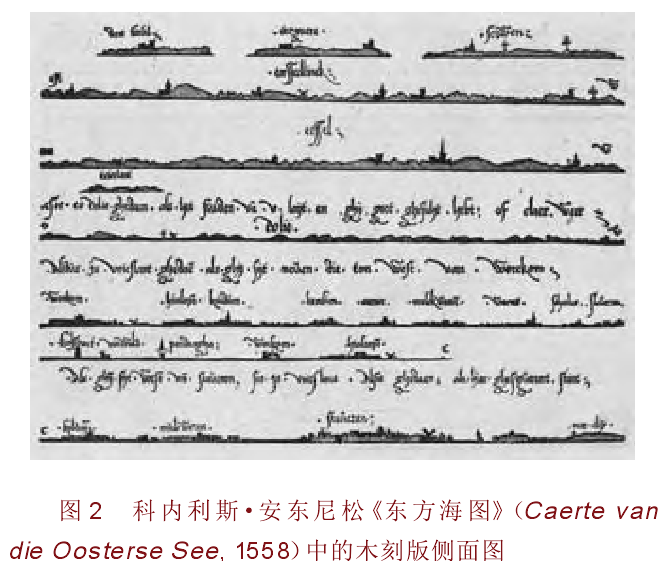 在欧洲附近海域的航行中,沿岸的侧面图(profile)对于水手来说更加实用,瓦赫纳在其《航海之镜》中广泛使用这种方法,其“最初贡献是在一系列连续的沿岸海图中一致地应用这一原则。一个水手一眼就能看出他要对付的是什么样的海岸(如:沙丘还是悬崖)。此外,沿着海岸的引人注目的建筑物,以及向内陆延伸的地平线(教堂塔、城堡、风车、树木和灯塔)都被绘入”(见图2)。这种侧面图与中国航海中所使用的山形水势地图和长卷式沿海图,虽然绘制与表现方法上存在明显差异,但视角与出发点明显是有相通之处的。