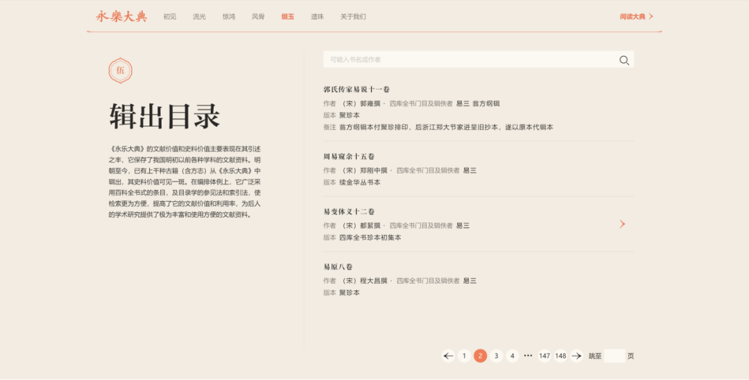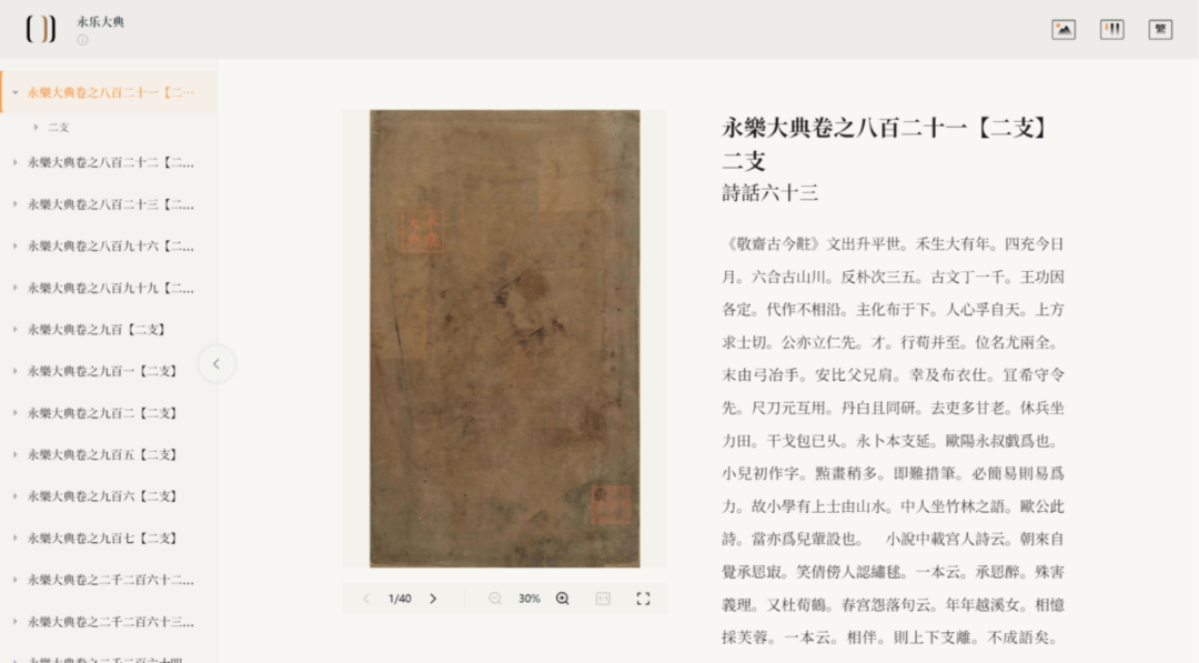 “《永乐大典》高清影像数据库”获取原始高清影像版权,取得专业内容授权,进行图像加工,清晰直观地展示《永乐大典》的外观、字体、版式、内容,方便读者一览《永乐大典》的神韵。